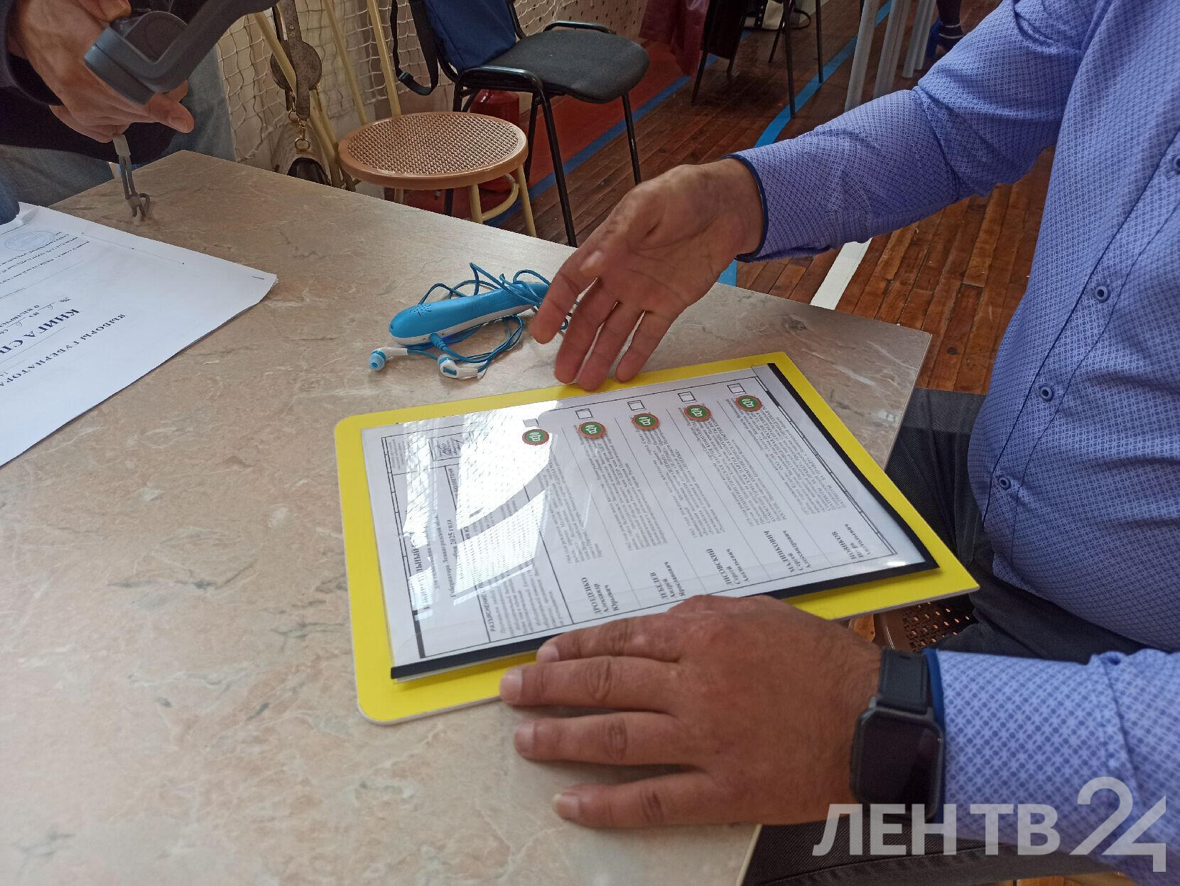 Слепые и слабовидящие люди голосуют на выборах губернатора Ленинградской области на 380-м избирательном участке в школе № 1 в Гатчине. Здесь есть специальный вспомогательный планшет с тифлокомментариями про каждого кандидата. Эта система позволяет инвалидам по зрению проголосовать самостоятельно.