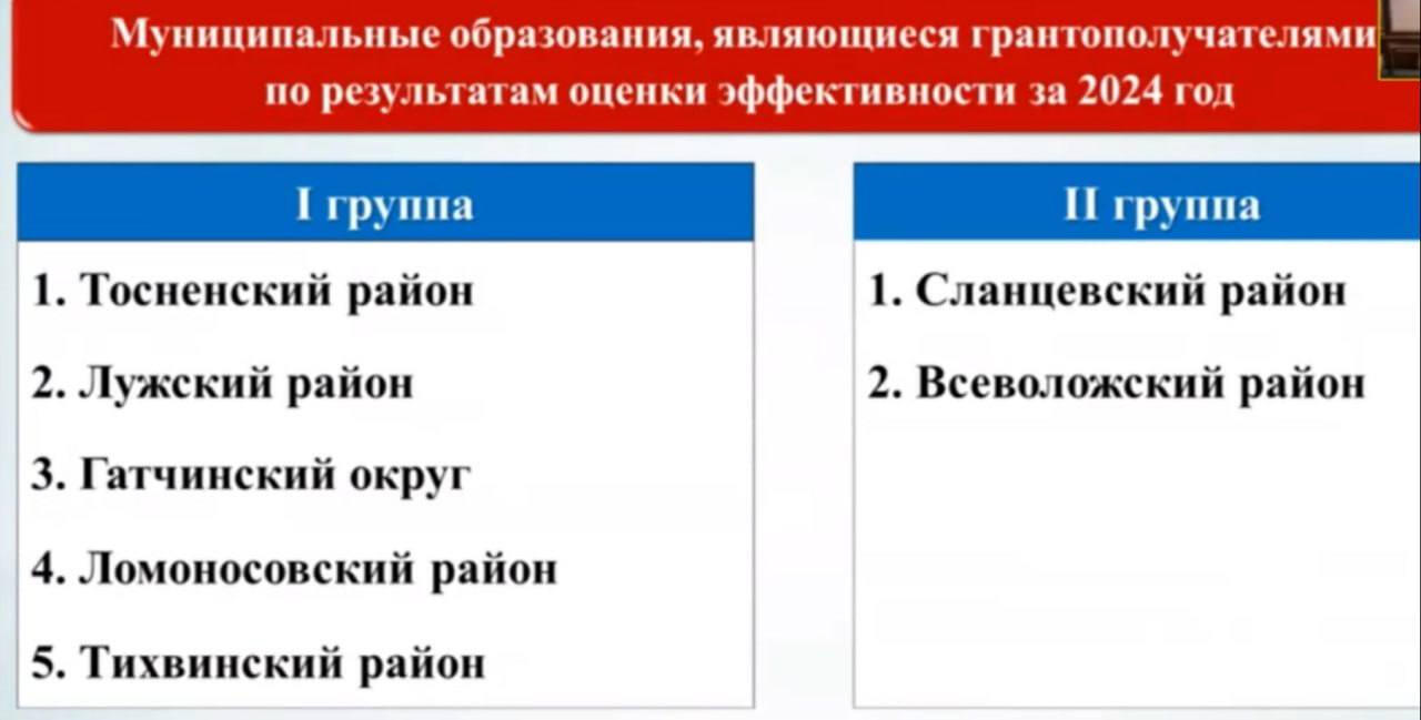 В первой группе лидером среди муниципальных образований, которые являются получателями гранта по результатам эффективности за 2024 год, стал Тосненский район. На втором и третьем местах расположились Лужский район и Гатчинский округ. Четвертую позицию занимает Ломоносовский район. Замыкает пятерку Тихвинский район. Во вторую группу вошли Сланцевский и Всеволожский районы. Общая сумма грантов составит 50 млн рублей.