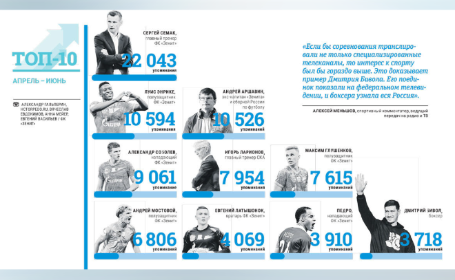 Также в десятку попали россияне Александр Соболев, Максим Глушенков и Евгений Латышонок. Их медийность выросла на фоне интереса к редким российским игрокам в «Зените» и выступлениям за сборную. Замыкает список чемпион мира по боксу Дмитрий Бивол, чья популярность продолжает расти.
