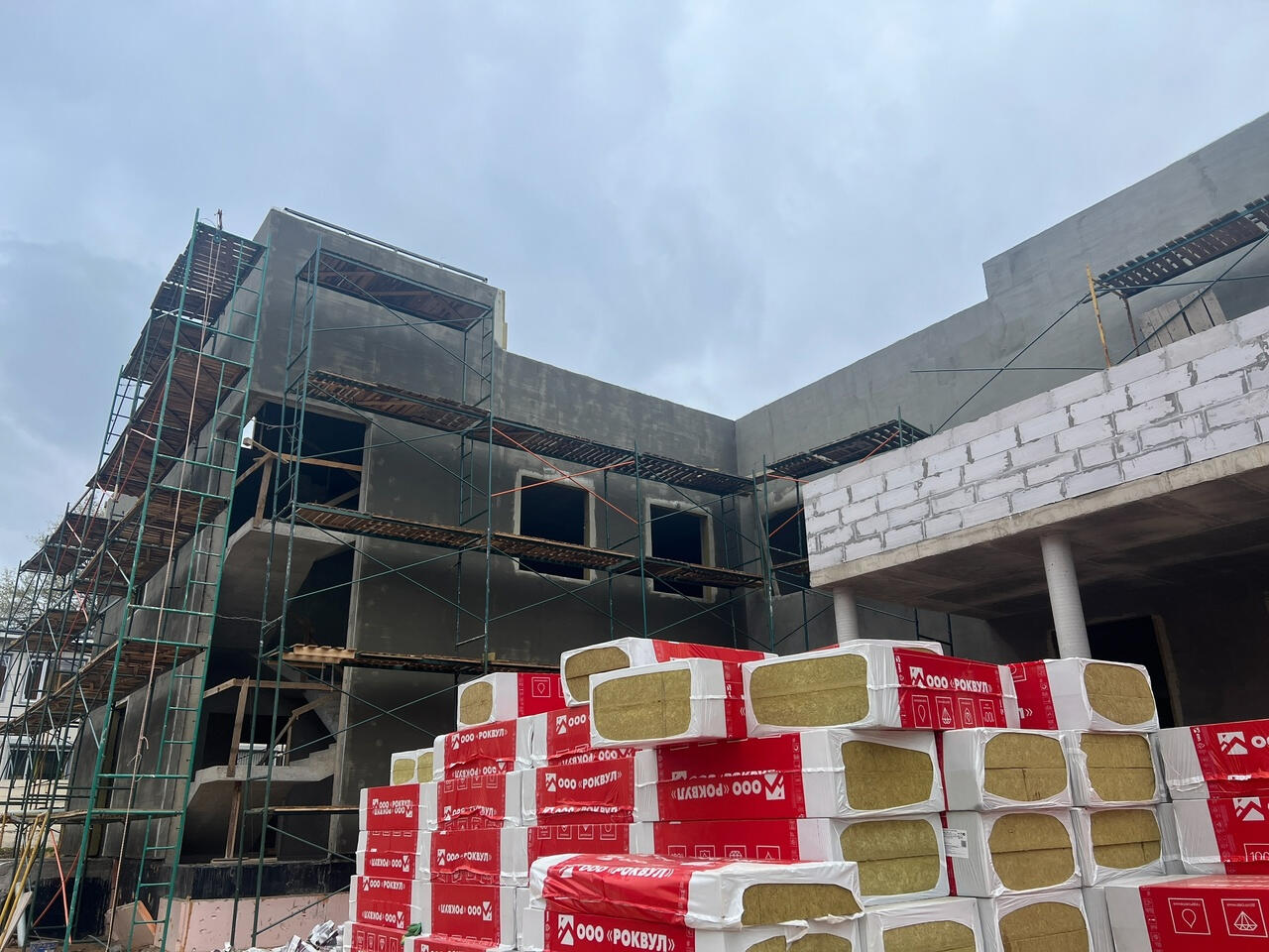 По информации ведомства, все фасады здания уже утеплены, покрыты выравнивающим грунтом и готовы к покраске. Частично установлены оконные рамы.