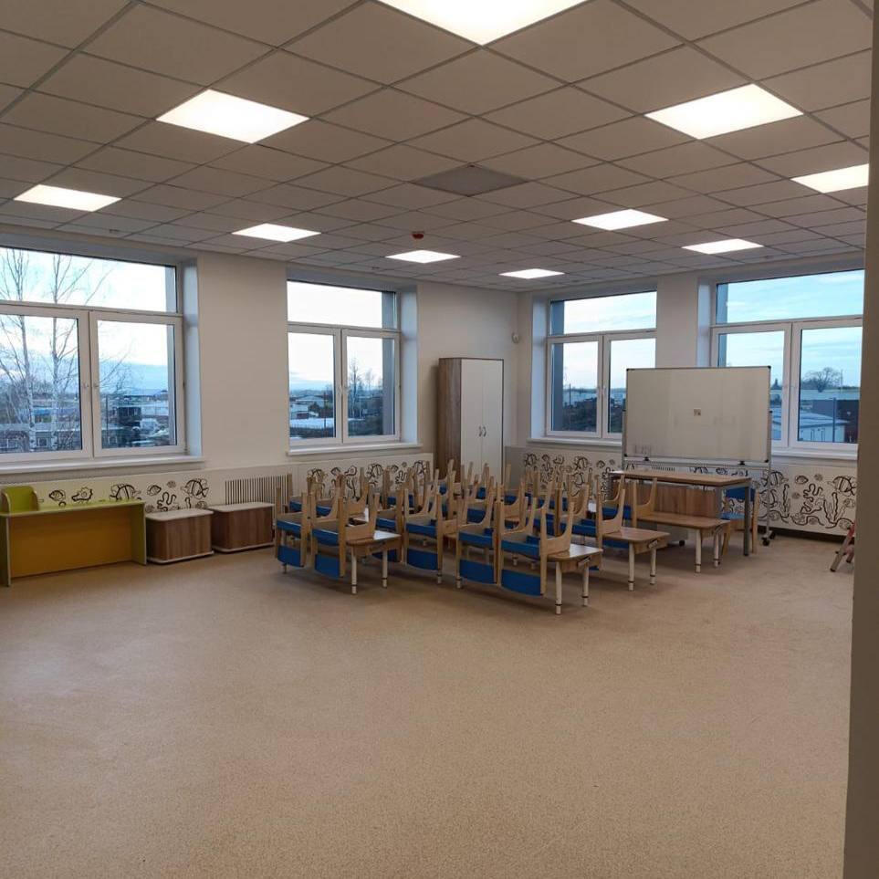 Рабочие ведут отделку, разводят электрические и инженерные сети, а также благоустраивают территорию, на которой дети смогут гулять и играть. В планах завершить строительство до конца 2025 года.