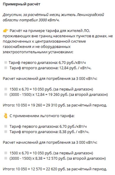 Также опубликован расчёт на примере тарифа для жителей, проживающих вне границ населенных пунктов в домах, не подключенных к централизованной системе газоснабжения и не оборудованных электроотопительными установками.