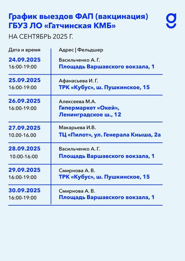 Гатчинская клиническая межрайонная больница опубликовала график выездов специалистов ФАП и адреса.