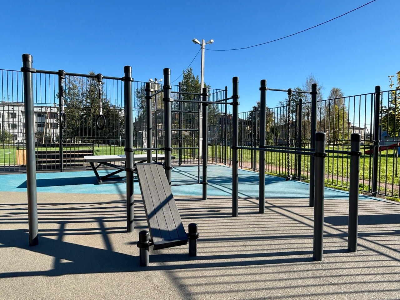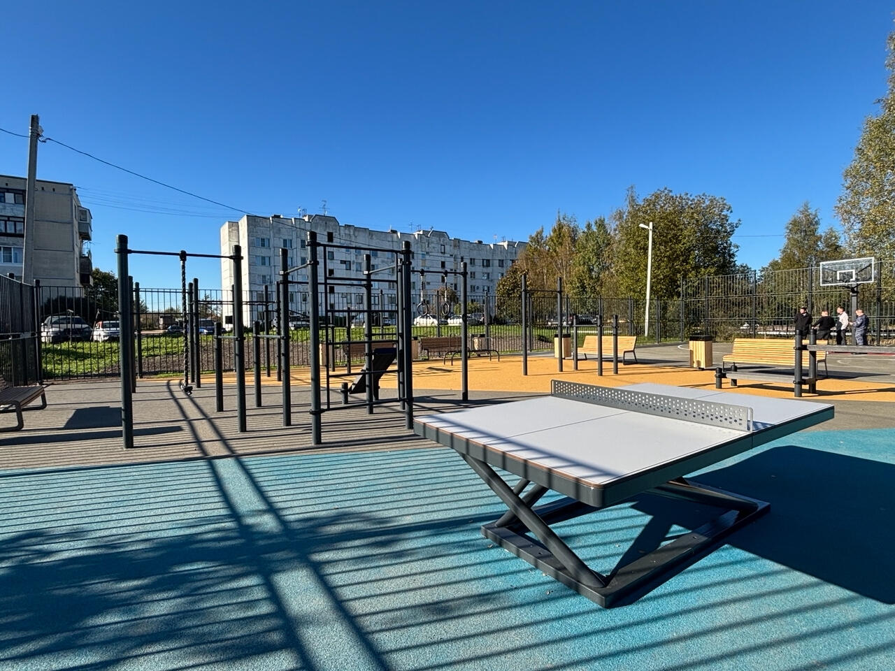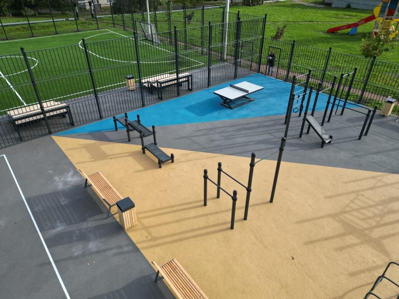 Это многофункциональное пространство, при проектировании которого учитывали интересы жителей разных возрастов. Любителей спорта уже ждут новое футбольное поле с профессиональным покрытием, баскетбольная площадка, стол для настольного тенниса и воркаут-зона: турники и брусья для силовых тренировок.