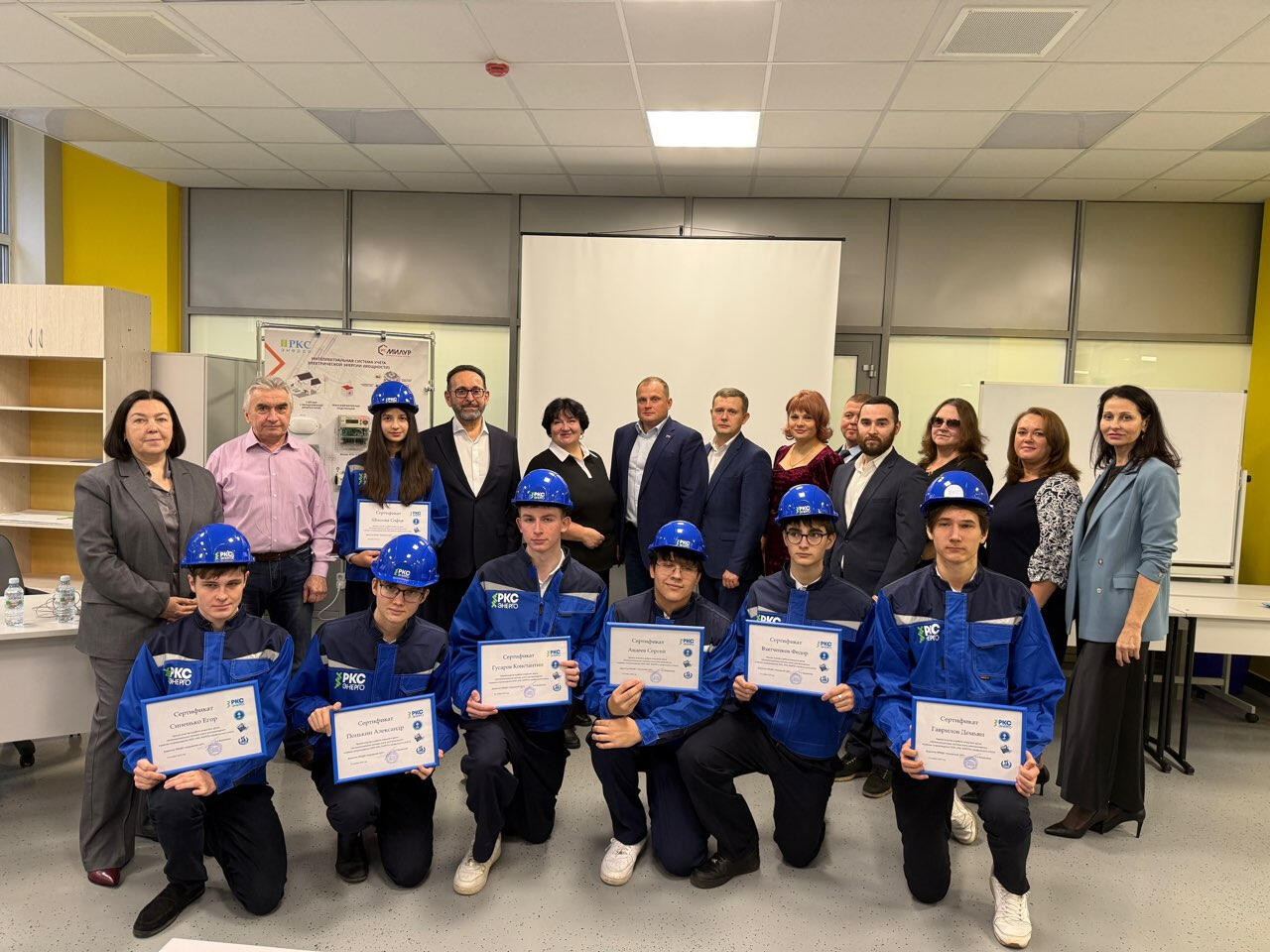 Затем уже в учебном классе началась торжественная часть. В кабинете присутствовали не только семь учеников Кировской гимназии и их куратор, которые будут взаимодействовать в рамках учебного процесса, но и 13 школьников девятого предпрофильного класса, занимающихся по программе «Мой выбор» модуль «Электромонтаж».
