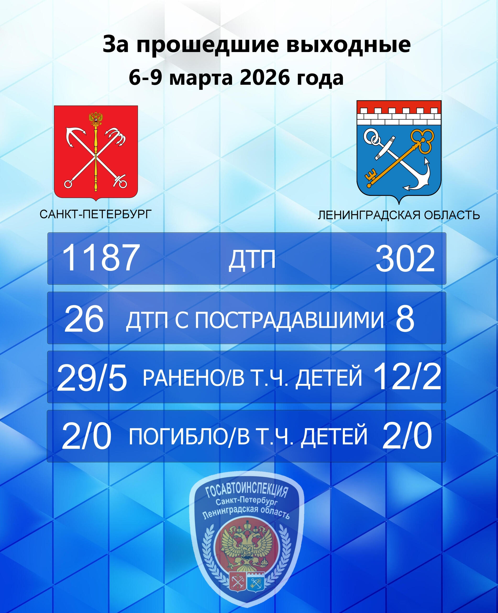 Управление Госавтоинспекции по Санкт-Петербургу и Ленинградской области опубликовало статистику дорожно-транспортных происшествий за период с 6 по 9 марта.