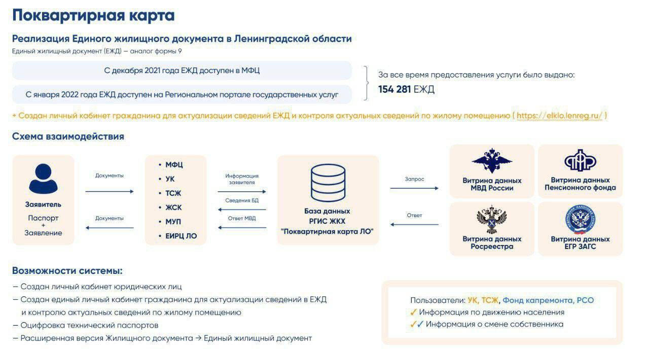 Особое внимание уделили развитию «Поквартирной карты ЛО» — приоритетного проекта губернатора Ленинградской области. В системе учтено более 1 млн действующих поквартирных карточек и более 3 млн архивных данных, включая сведения с 1930 года. Система интегрирована с МВД, Росреестром, ЕГР ЗАГС, ПФР и МФЦ, что позволяет получать единый жилищный документ (аналог справки формы 9) через региональный портал госуслуг.