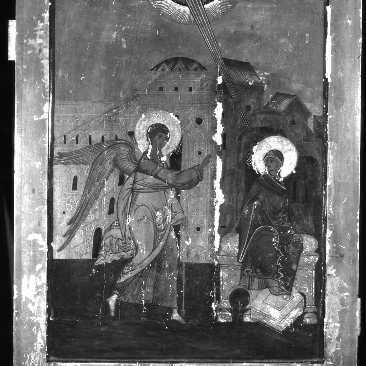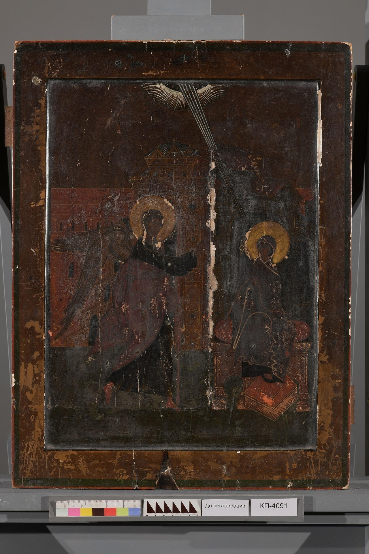 Икона представляет собой два навершия Царских врат, «врезанных» в новую основу и соединенных в один образ Благовещения.