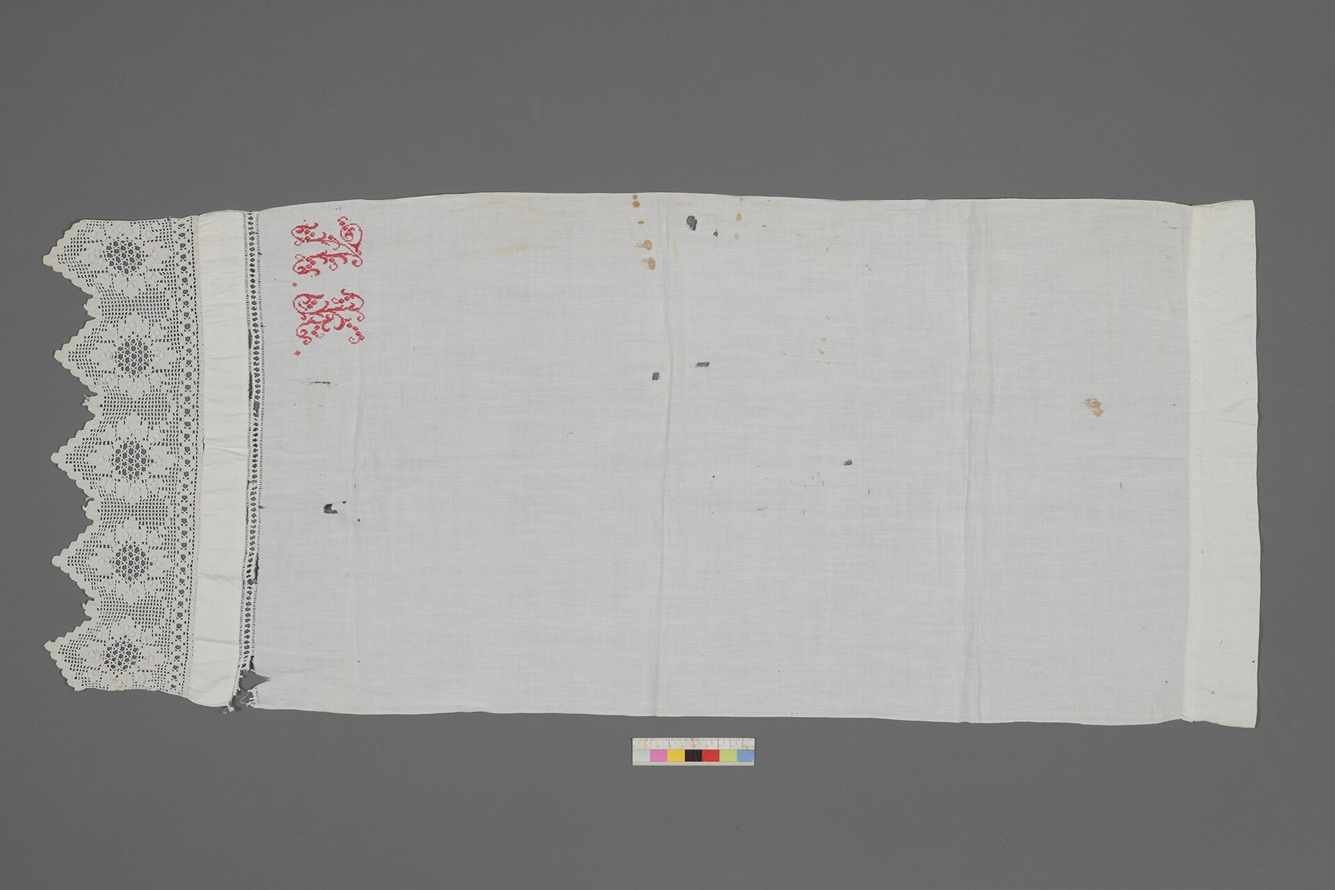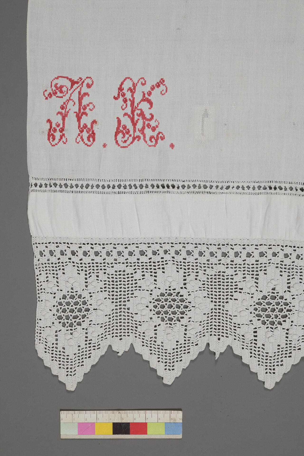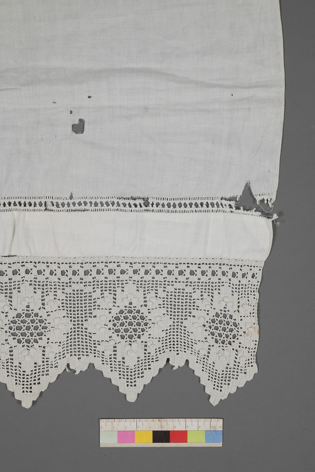 красной вышивкой крестом, мережкой и, предположительно, свирским кружевом.