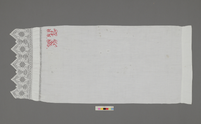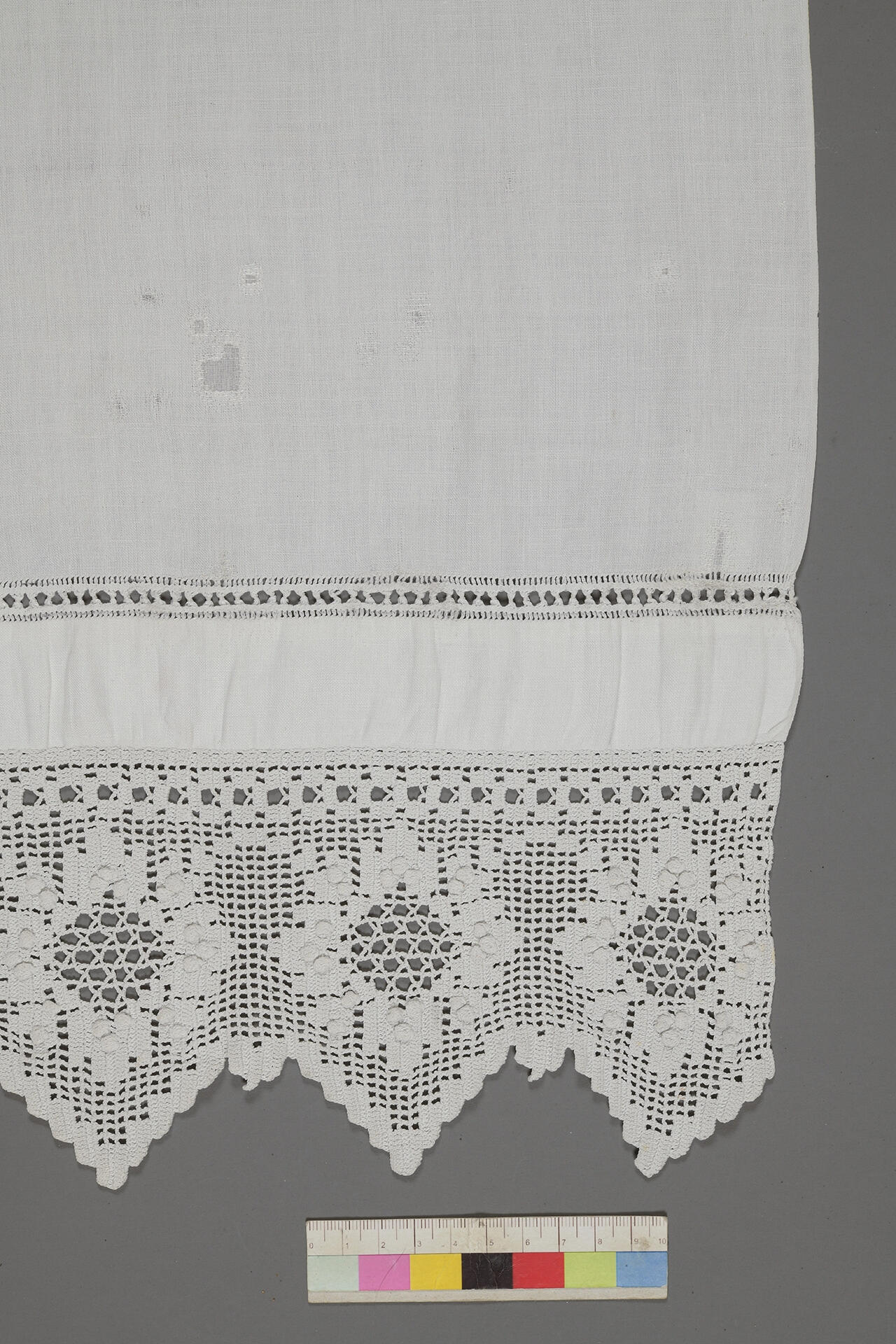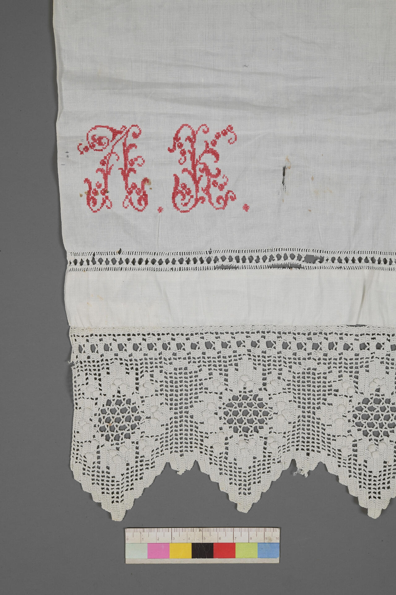 красной вышивкой крестом, мережкой и, предположительно, свирским кружевом.