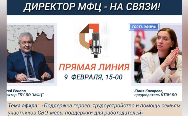 На вопросы зрителей ответят директор МФЦ Ленинградской области Сергей Есипов, председатель комитета по труду и занятости населения Юлия Косарева и директор Кадрового центра Татьяна Иванова. Эксперты расскажут о возможностях трудоустройства, профессионального обучения и переобучения, а также об оформлении мер социальной поддержки для участников СВО через МФЦ. В эфире также обсудят реальные примеры запуска собственного дела при поддержке кадрового центра и другие программы помощи военнослужащим.