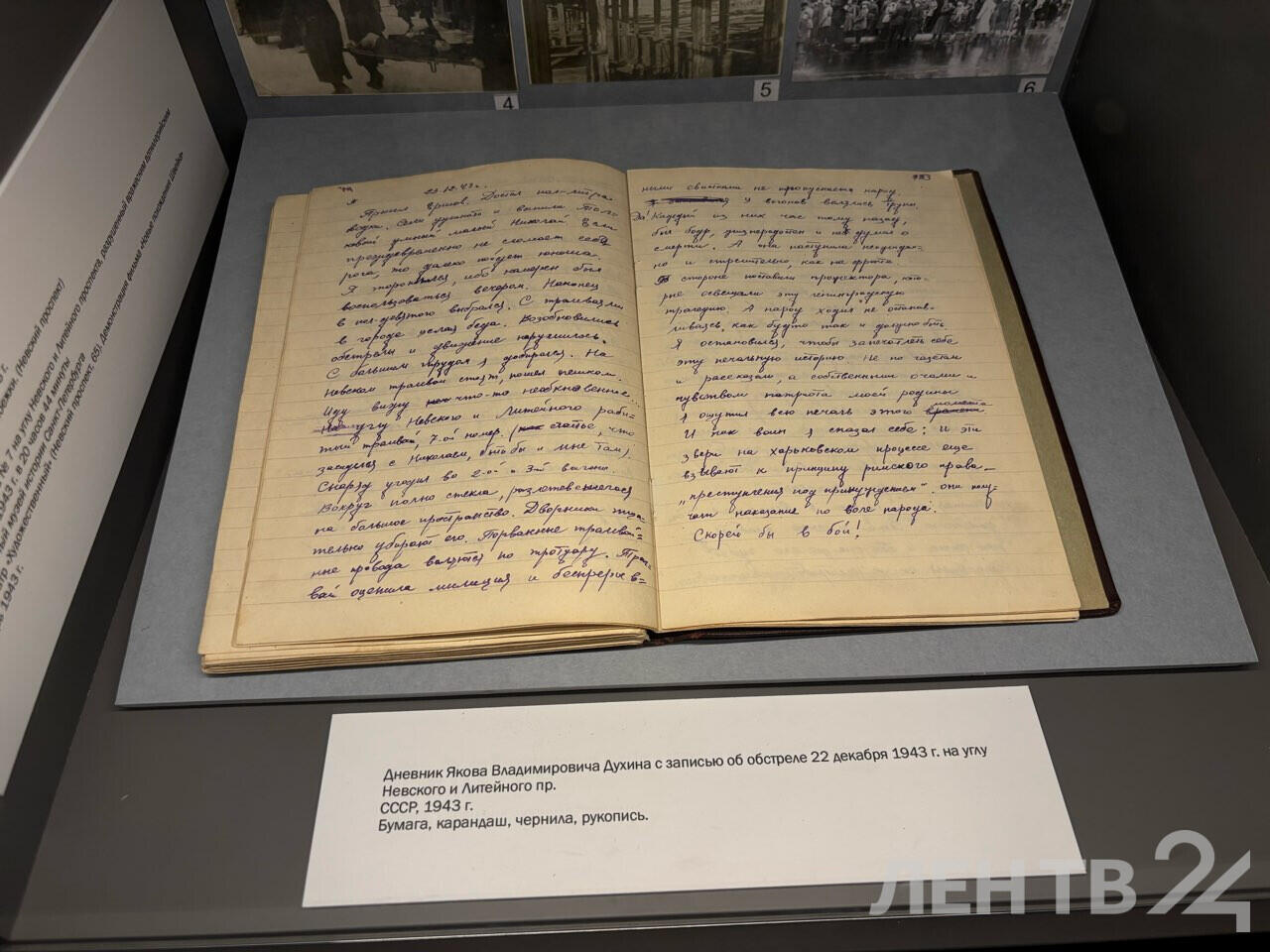 Впервые в музее представлены такие экспонаты, как дневник командира стрелкового батальона Якова Духина, автографы Ольги Берггольц и Леонида Утёсова и подлинный костюм балерины Натальи Сахновской, предоставленный народным музеем «А музы не молчали…»