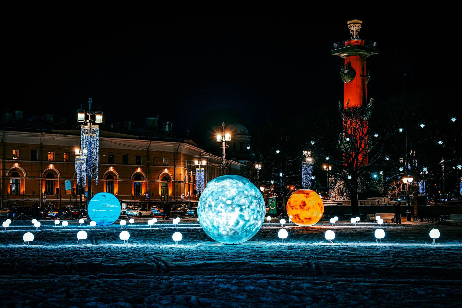 Новые и обновлённые элементы появились и в других районах города. На стрелке Васильевского острова установили мультимедийную ёлку высотой 20 метров и композицию «парад планет». Конногвардейский бульвар украсили световыми арками и декоративными львами, у Медного всадника засияла ёлка в цветах российского флага.