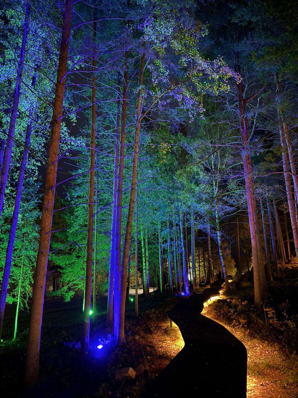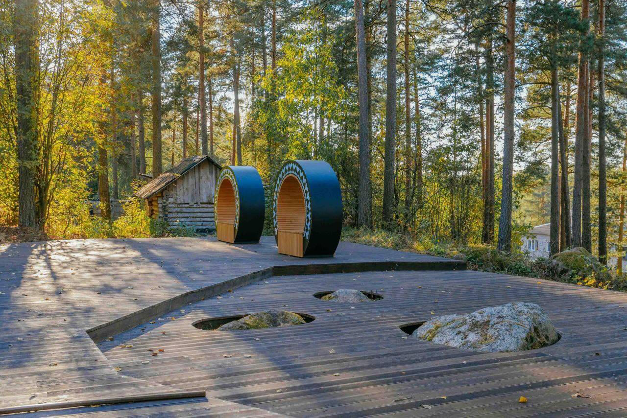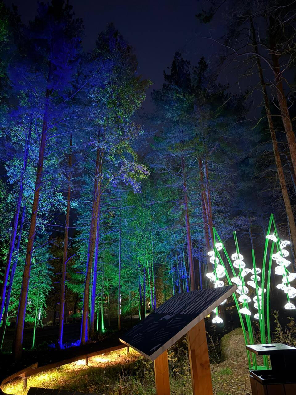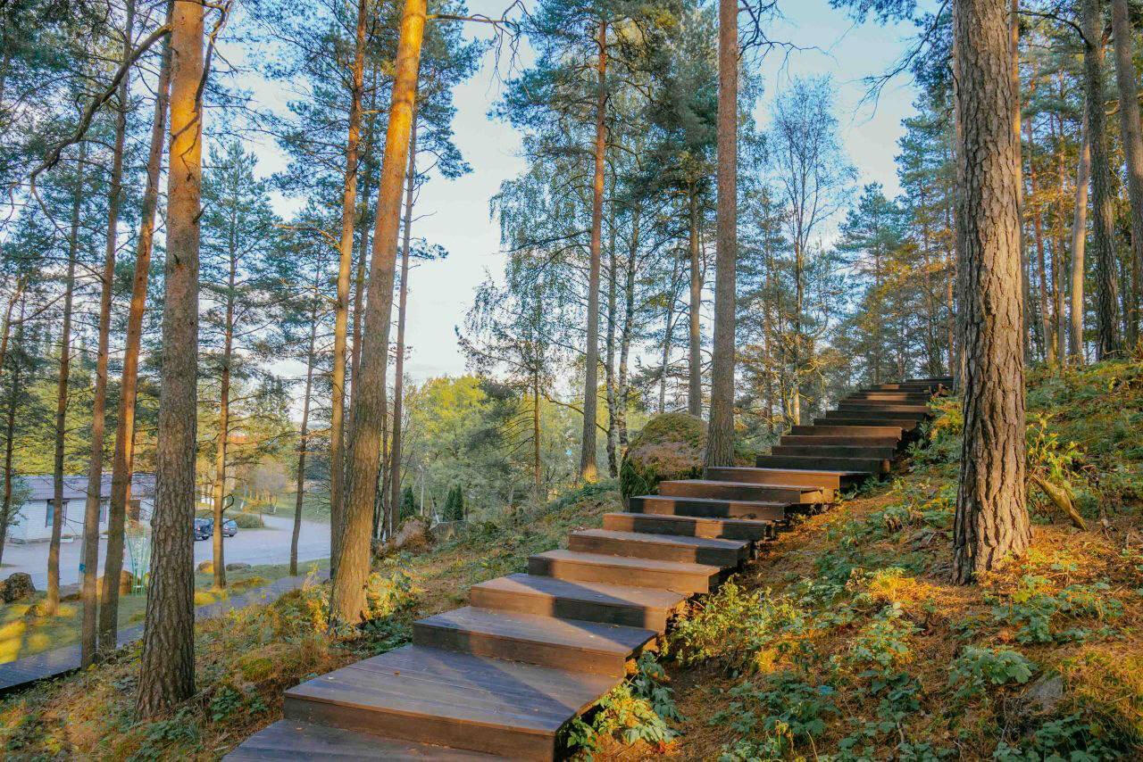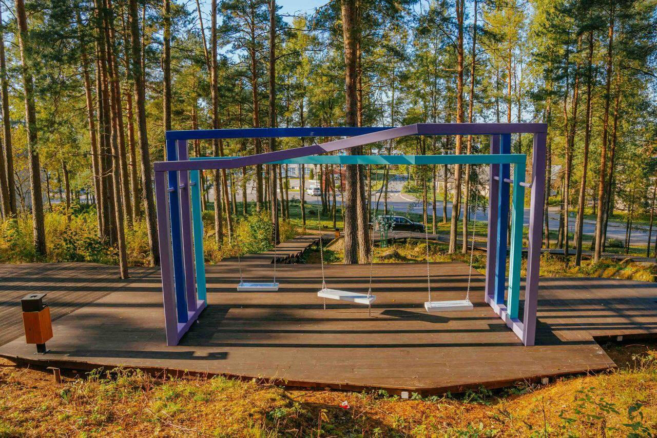 Тропы сделаны из натуральных материалов — дерева и гранитного отсева. Они повторяют изгибы рельефа. Отдыхающие могут покачаться на качелях и оценить бережно включенные в проект валуны. Опоры светильников по цвету и форме словно стволы деревьев, органично вписываются в природный пейзаж, освещая дорожки, поэтому здесь можно прогуляться и вечером.