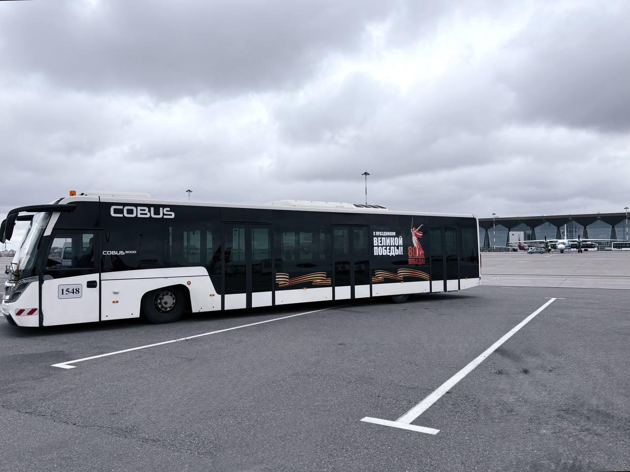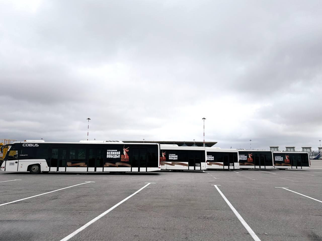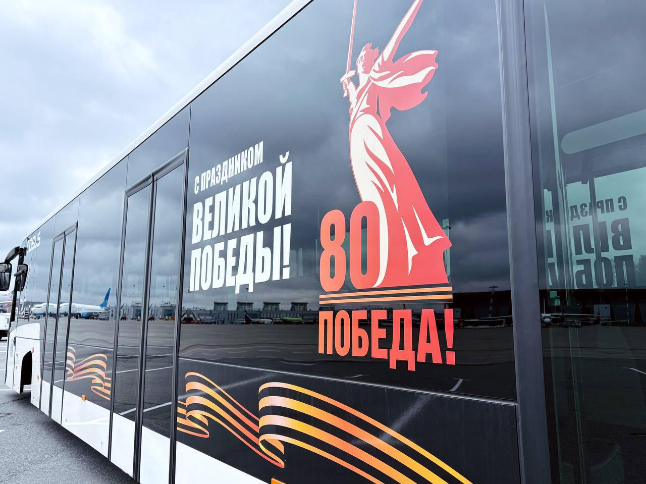 В Пулково автобусы украсили юбилейной символикой ко Дню Победы