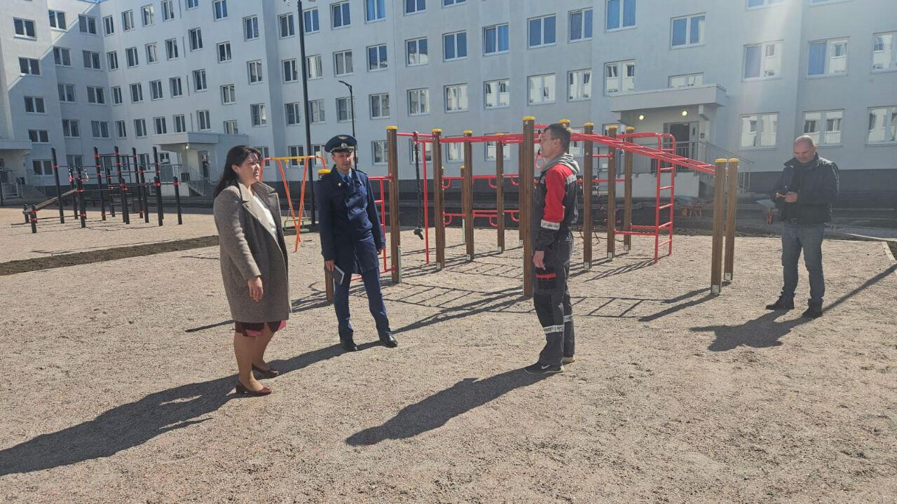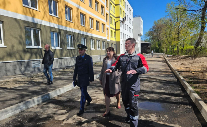 Прокурор оценил качество строительства на улице Карла Маркса, 4. В частности, проверено благоустройство территории, установка детской и спортивной площадок, а также готовность квартир к заселению. В настоящее время завершаются работы по укладке второго слоя асфальта и обустройству газонов.