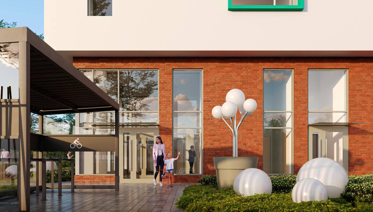 На территории планируется малоэтажная разряженная застройка с большой площадью озеленения, школа и два детских сада, которые создадут комфортные условия для воспитания и развития детей.