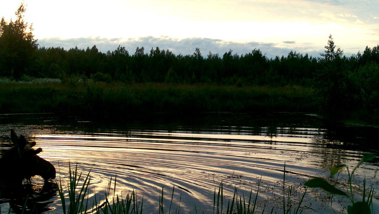 В заказнике Юнтоловский лесной великан решил принять раннюю утреннюю ванну. Красавец освежился и отдохнул в воде от кровососов, коих сейчас много. Рога у самца растут и уже ветвятся. Зрение у лосей плохое, зато они могут похвастаться хорошим слухом и обонянием. В какой-то момент животное почувствовало, что его снимают.