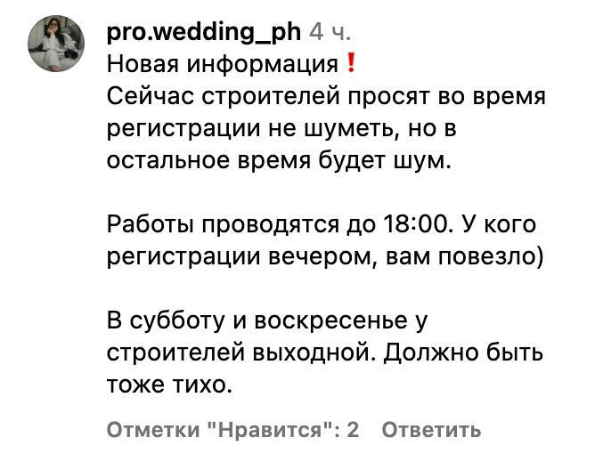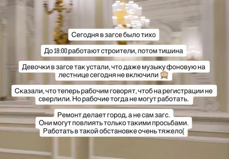 По словам свадебного фотографа Ольги Расцветаевой, ремонтом занимается город, а не сам ЗАГС, так что сотрудники никак не могут повлиять на процесс. При этом есть информация, что шумные работы стараются приостанавливать на момент регистрации пар.