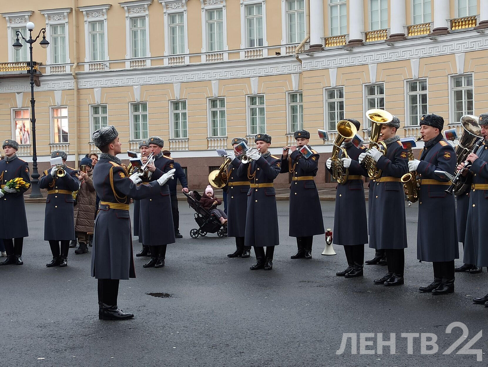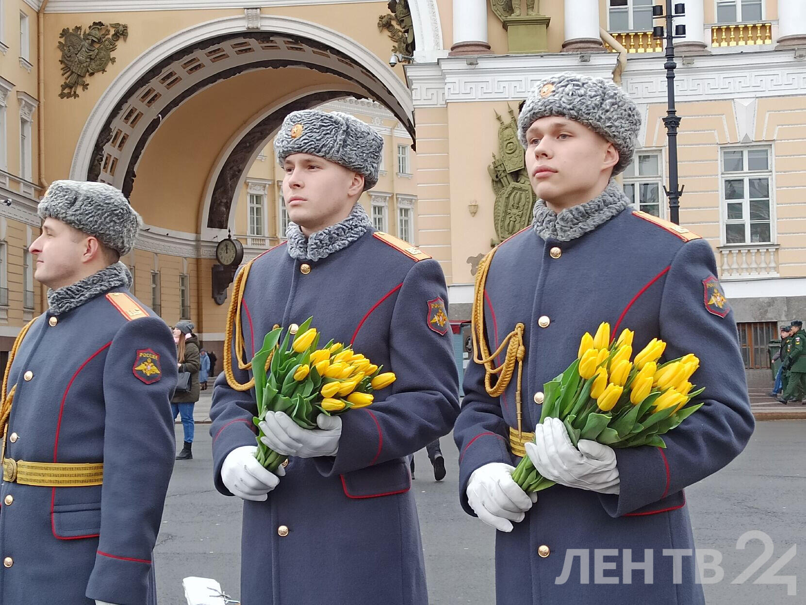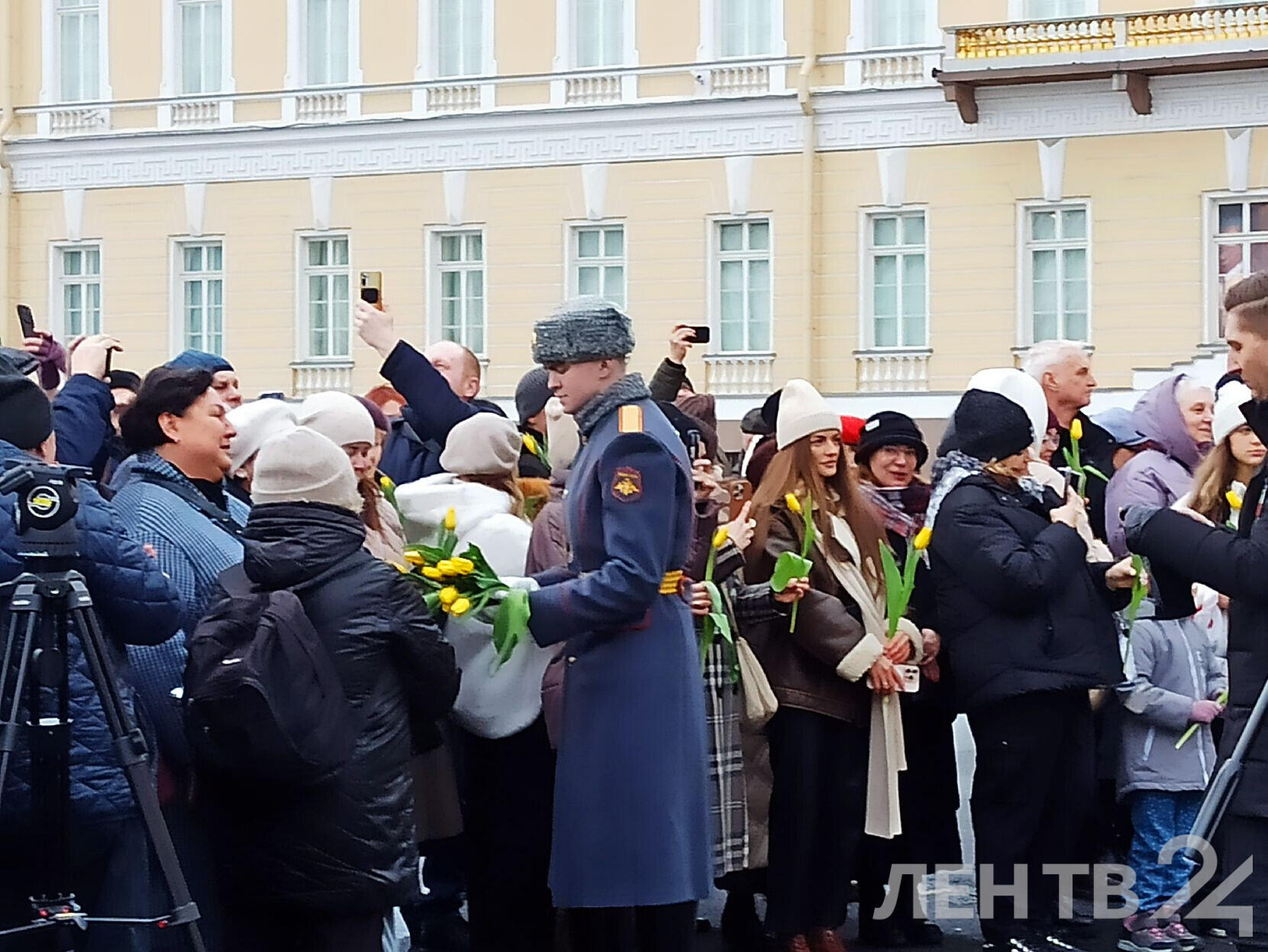 По случаю праздника они устроили в центре города настоящее представление. Под звуки любимых композиций в исполнении военного оркестра штаба Ленинградского военного округа военнослужащие роты почетного караула, облаченные в парадную форму, дарили цветы женщинам в самом сердце Северной столицы на Дворцовой, Сенатской и Казанской площадях.