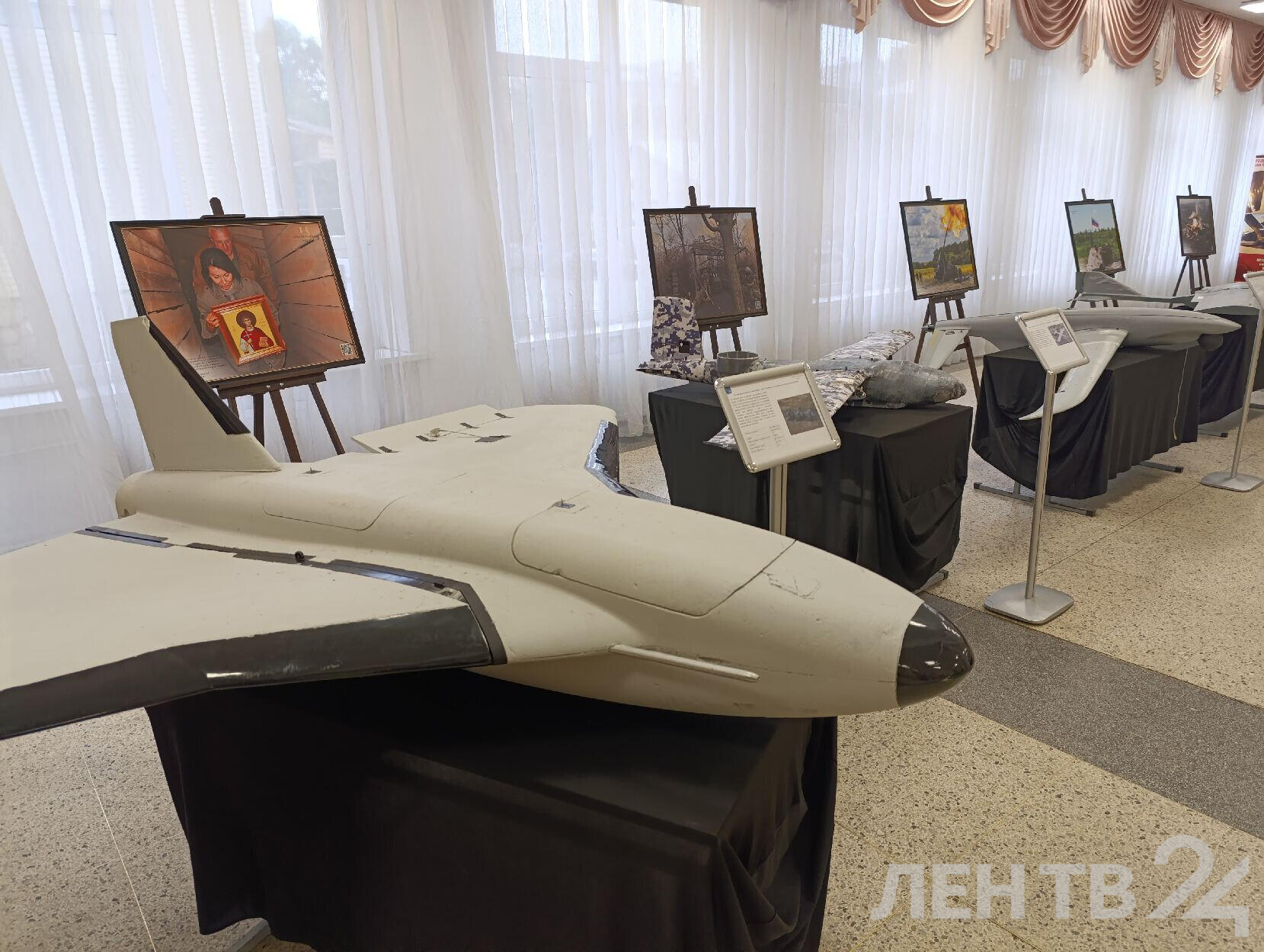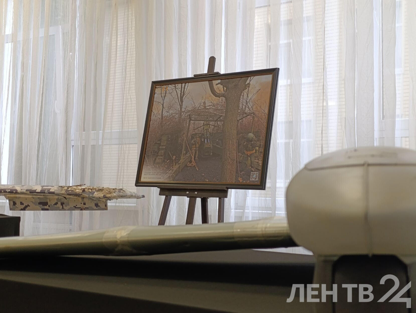 Здесь можно увидеть трофейные беспилотники и фотографии с передовой.