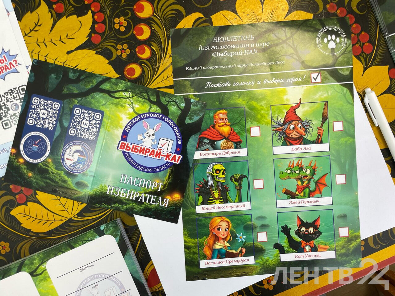 Сначала детям показывают мультик с предвыборной программой «кандидатов», среди которых Богатырь Добрыня, Василиса Премудрая, Змей горыныч, Кащей бессмертный, Кот ученый и Баба-яга. Юные участники получают паспорт избирателя, расписываются в журнале учета, получают бюллетень и идут в теремок, чтобы сделать свой выбор.