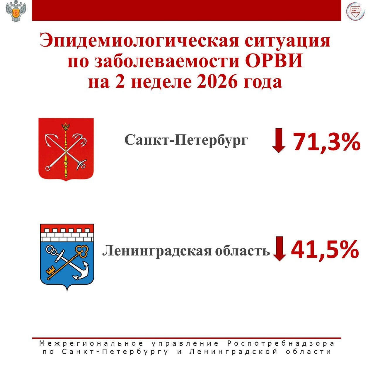 На второй неделе 2026 года уровень суммарной заболеваемости ОРИ и гриппом в Северной столице по сравнению с предыдущей снизился на 71,3 %. Уточняется, что эпидемические пороги по совокупному населению не превышены. На случаи гриппа приходится 13,3 %, среди негриппозных вирусов преобладают SARS-CoV-2, сезонные коронавирусы, риновирусы, аденовирусы. Заболеваемость COVID‑19 уменьшилась в 2,2 раза по сравнению с первой неделей этого года.