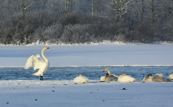 Зимняя сказка на Вуоксе: лебеди-кликуны остались зимовать в Приозерске